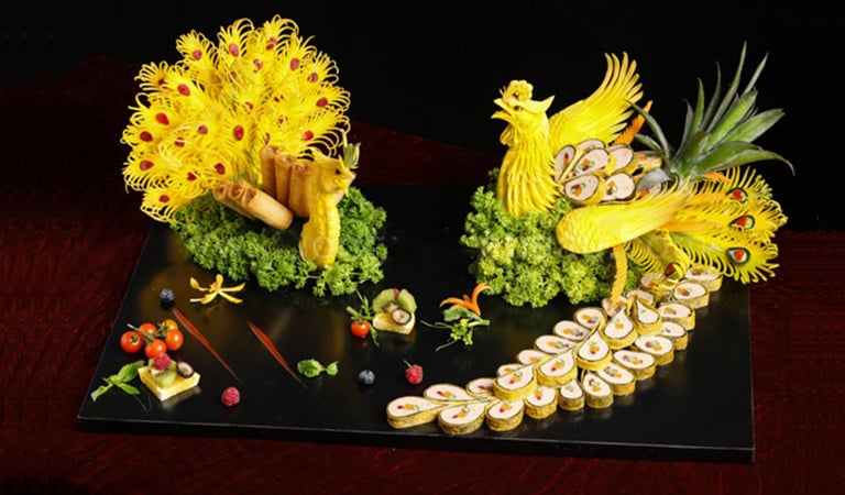 Aesthetics and Miniaturization (Mỹ Thuật và Thu Nhỏ): Above all, the food was required to be a visual feast. Presentation was paramount, often elevating the dishes to miniature masterpieces. Ingredients were meticulously carved into decorative, symbolic shapes (e.g., flowers, mythical creatures like dragons or phoenixes) and arranged in complex, multi-tiered stacks. The smaller the portion, the more intricate the carving, the higher the perceived value and refinement of the cooking skill.