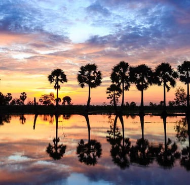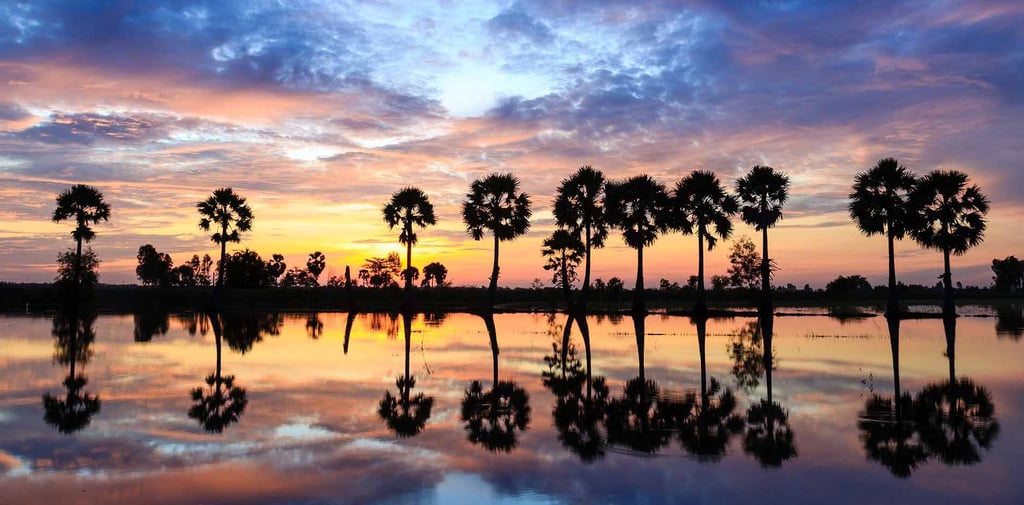 The intense heat of the Delta day is replaced by a profound yên bình của vùng quê Việt Nam (peace of the Vietnamese countryside). The colors are intense—the red of the sun melting into the blue of the sky and reflecting deeply onto the still water of the rice fields below. The proximity to Cambodia and the high concentration of temples and spiritual sites in Châu Đốc adds a layer of quiet, contemplative mysticism to the scene, turning the viewing into a sacred, reflective pause.