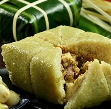 Bánh Chưng/Bánh Tét: The ceremonial heart of Tết (Lunar New Year), these sticky rice cakes are filled with savory mung bean and pork, wrapped tightly in banana leaves, and boiled for up to twelve hours. They are symbols of gratitude to Earth and Sky and represent one of the most significant ceremonial uses of sticky rice (gạo nếp).