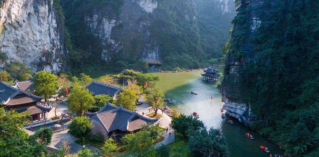 Like Ha Long Bay, Tràng An is defined by towering karst limestone structures, but here, the geology is experienced from the interior. The vast, interconnected system of rivers, streams, and flooded caves is the primary axis of travel. The water, which sculpted the limestone over millennia, is not a separate element; it is an integral part of the architectural structure, functioning as both moat and highway. The boats glide through the flooded rice fields and into the dark, silent chambers of the caves, providing a continuous, breathtaking visual narrative.